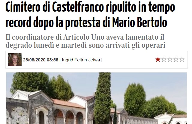 CASTELFRANCO – “Scopo raggiunto”: commenta Mario Bertolo dopo il capillare lavoro di pulizia del cimitero di Castelfranco Veneto eseguito dalla Municipalità all’indomani delle affermazioni di biasimo del coordinatore di Articolo Uno, per lo stato di abbandono del camposanto.